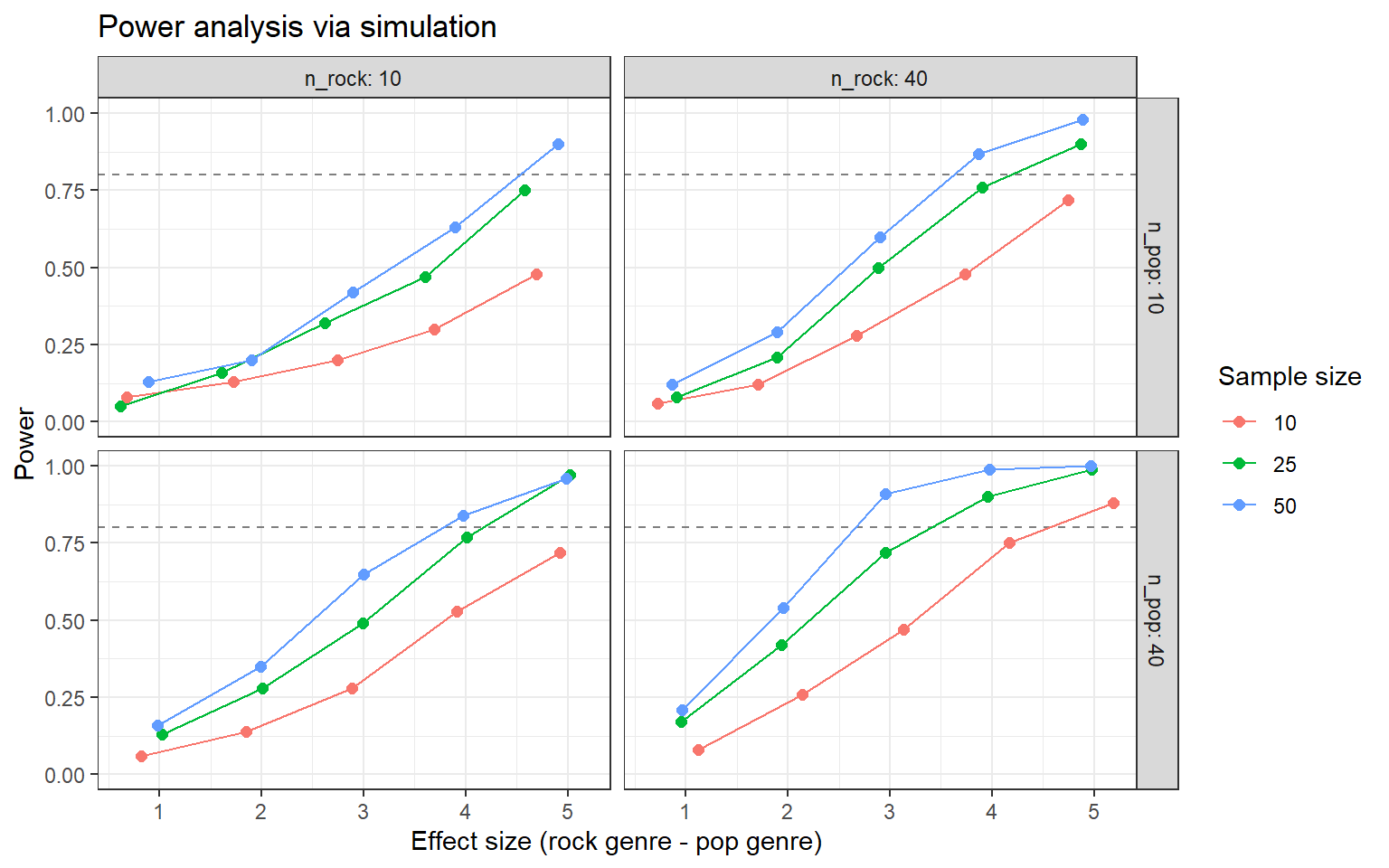 To give an overview of the power simulation task, we will simulate data from a design with crossed random factors of subjects and songs (see Power of What? for design details), fit a model to the simulated data, recover from the model output the parameter values we put in, calculate power, and finally automate the whole process so that we can calculate power for different effect sizes. Much of the general workflow here is borrowed from DeBruine & Dale (2021) Understanding Mixed-Effects Models through Simulation. We’ll start by writing code that simulates datasets under the alternative hypothesis.