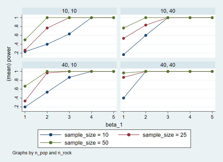 twoway (connected power beta_1 if n_subj == 10, sort) (connected power beta_1 if n_subj == 25, sort) (connected power beta_1 if n_subj == 50, sort), scheme(s2color) by(n_pop n_rock) legend(lab(1 "sample_size = 10") lab(2 "sample_size = 25") lab(3 "sample_size = 50"))